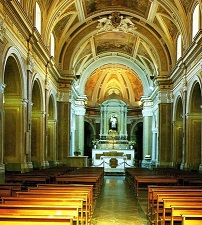 gli interni sono interamente rivestiti in marmo. La struttura si sviluppa in tre navate; l’abside e le cappelle sono state realizzate sul lato sinistro.